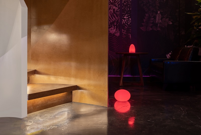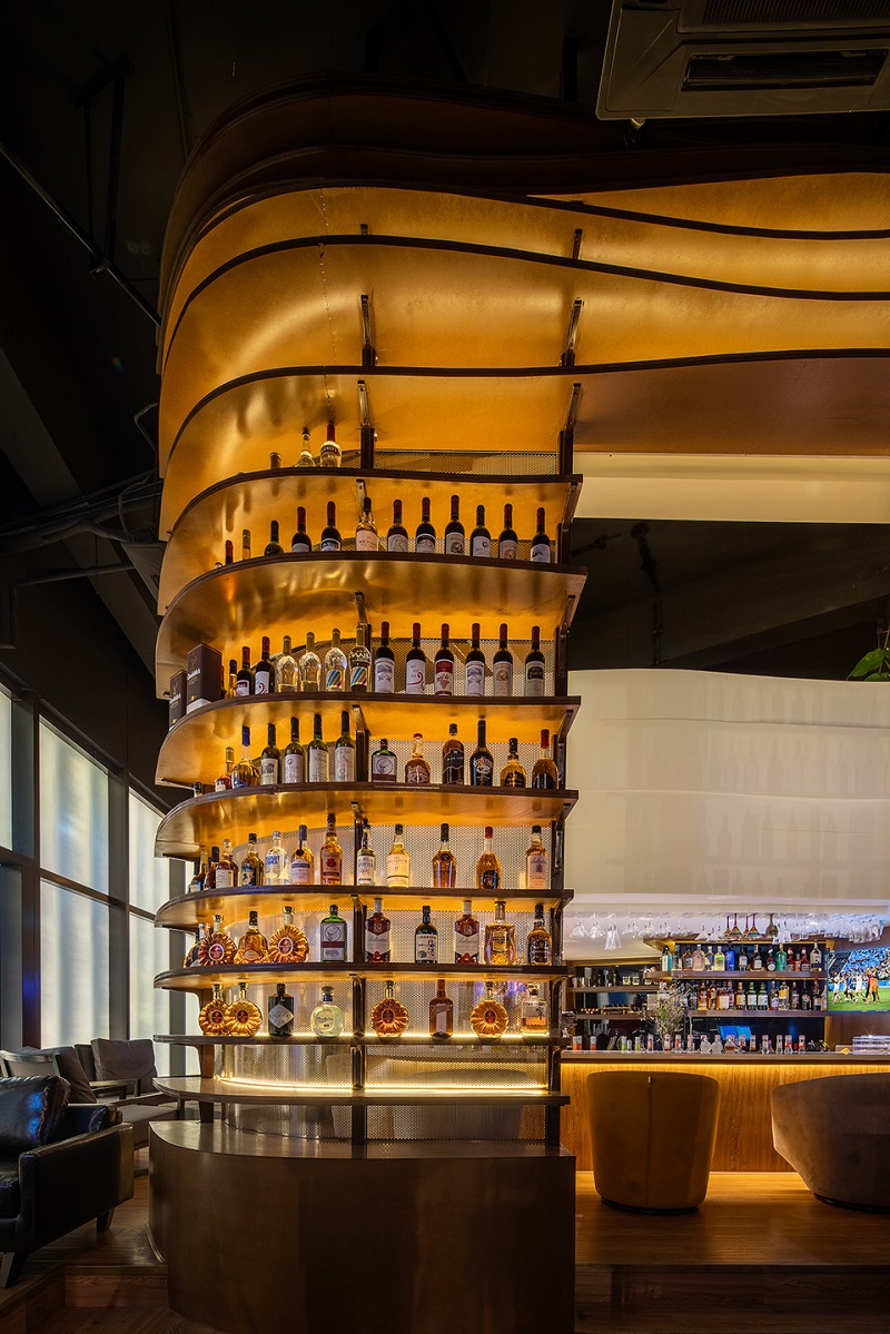設計技巧:運用豐富的視覺感官創造動靜相宜的酒吧空間,以吧臺為核心和原點,刻意抬高的組合設計將空間分割成不同的功能區域。利用原建筑層高的優勢,通過具有雕塑感的雙螺旋